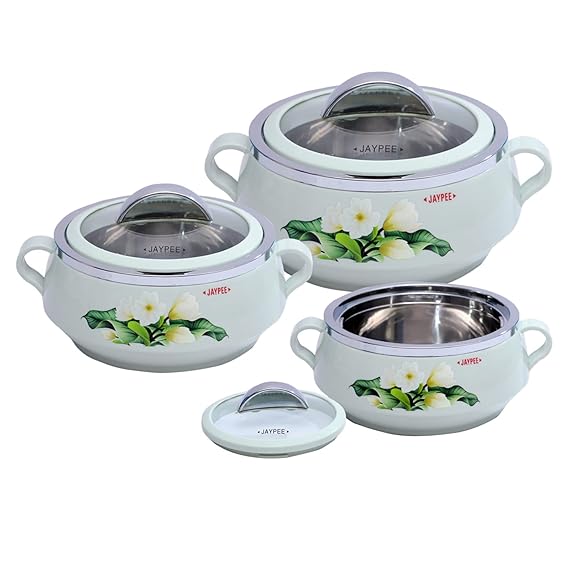 Jaypee Ceramika casserole set is crafted out of best materials with elegant finish and flower print and a transparent glass lid. It’s suave and sleek finish with artistic chrome finished top and bottom unique shape designed body looks elegant on dining table. The inner finished liner parts are fabricated out of non-magnetic stainless steel sheet. The plastic outer body is moulded out of virgin food grade plastic. Material Used: Top bottom & knob-ABS (chrome plated) Body-PP Cover-glass Insulation-polyurethane. Food grade BPA Free.