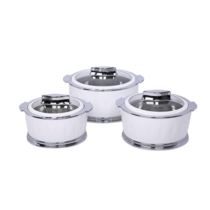 SANJEEV KAPOOR Ornate Casserole Insulated Inner Stainless Steel Pack of 3 casseroles is crafted out of best materials with elegant plated top with knob and a transparent glass lid. Now you can cook & display with pride the appetising food with your fine finish, garnish and flourish with special toppings. A safety hole in the glass lid not only makes it antilock, it also lets out the aroma. The inner container is made out of stainless steel. The plastic outer body is of virgin plastic with beautiful graphic exteriors which is inspired by creamic surfaces. Material Used: Top-PP, Ring-ABS(chrome plated), Base-PP, Container-Stainless steel and insulation is of polyurethane material. Food grade, BPA Free.